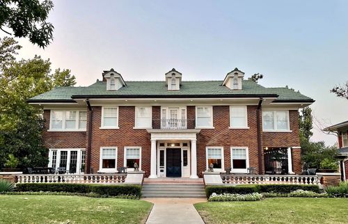 In 1923 this Colonial Revival home was built by Mr. and Mrs. Gordon Taylor, owners of the Taylor Marble and Tile Company. The home was both their residence and a showcase for their finest products and workmanship. Their work could also be found in the First National Center and the Skirvin Hotel.