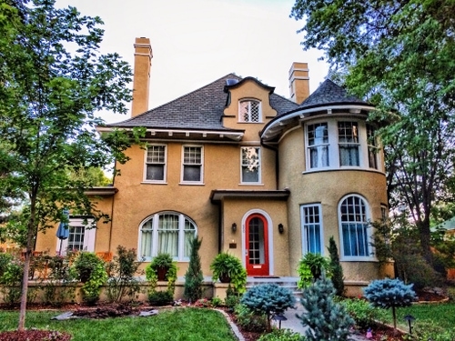 The exterior of the home is dominated by the large two-story round turret with a conical roof, a feature lifted directly from Queen Anne. Other design elements taken from the nineteenth century include the tall chimneys, the asymmetrical arrangement of the façade, the bay window, and the juxtaposition of the arched and rectangular windows. The original covered porch on the east is now an enclosed sunroom. Unlike classical Victorian-era homes, however, the lines are cleaner with fewer embellishments, drawing a distinctive line between the fading Gothic taste and the contemporary onset of Colonial Revival.