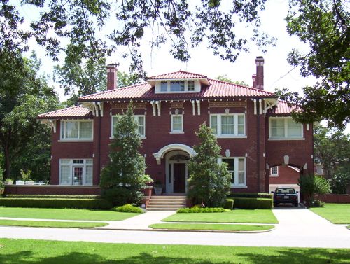 The design was patterned after the Skelly home in Tulsa, an enriched Mediterranean motif that included a tiled roof, oversize brackets under the eaves, arched portico, and white keystones above the windows and on the porte cochere.